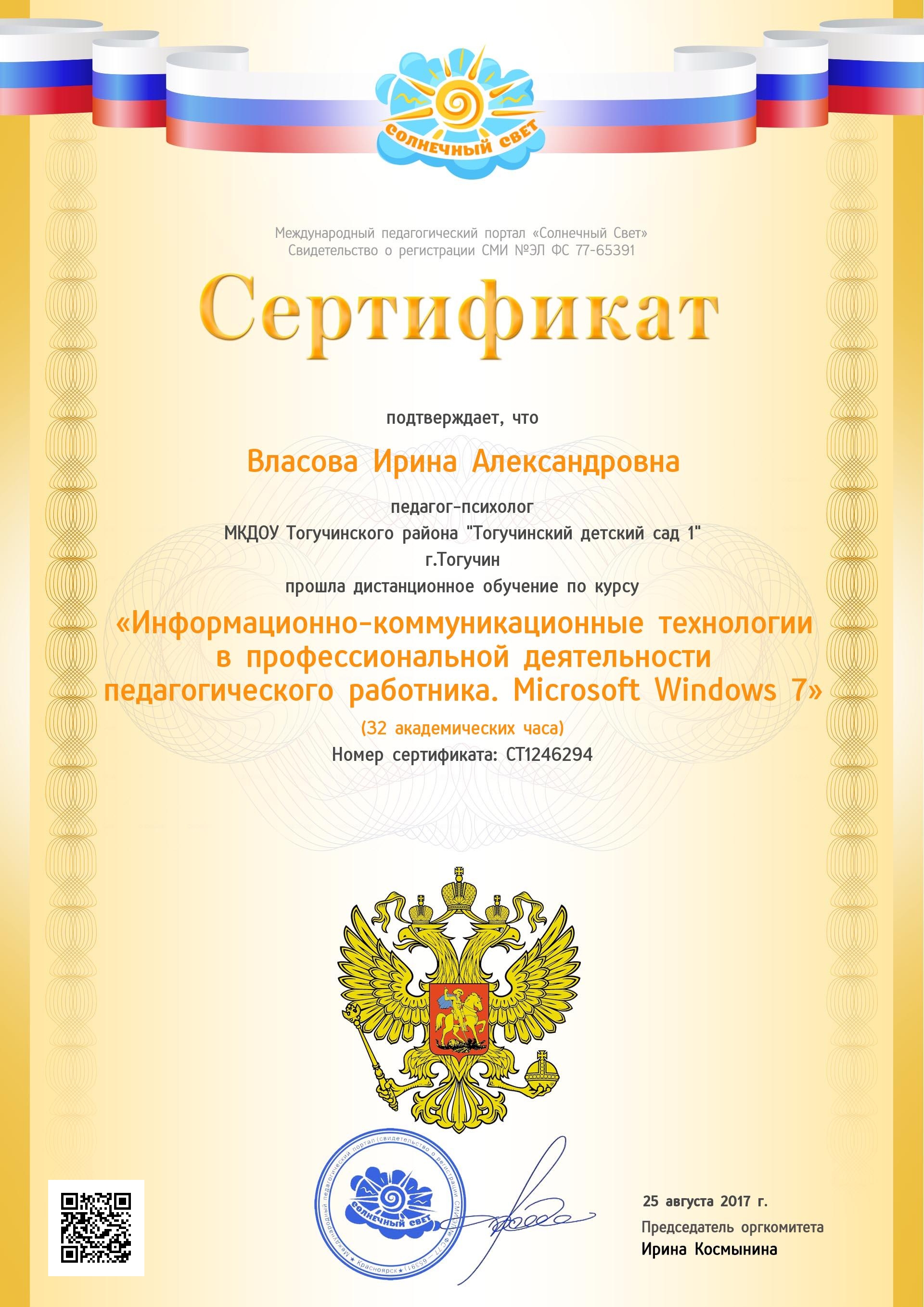 - Август 2107г. «Информационно-коммуникационные технологии в профессиональной деятельности педагогического работника», «Солнечный свет», в объеме 32 часа