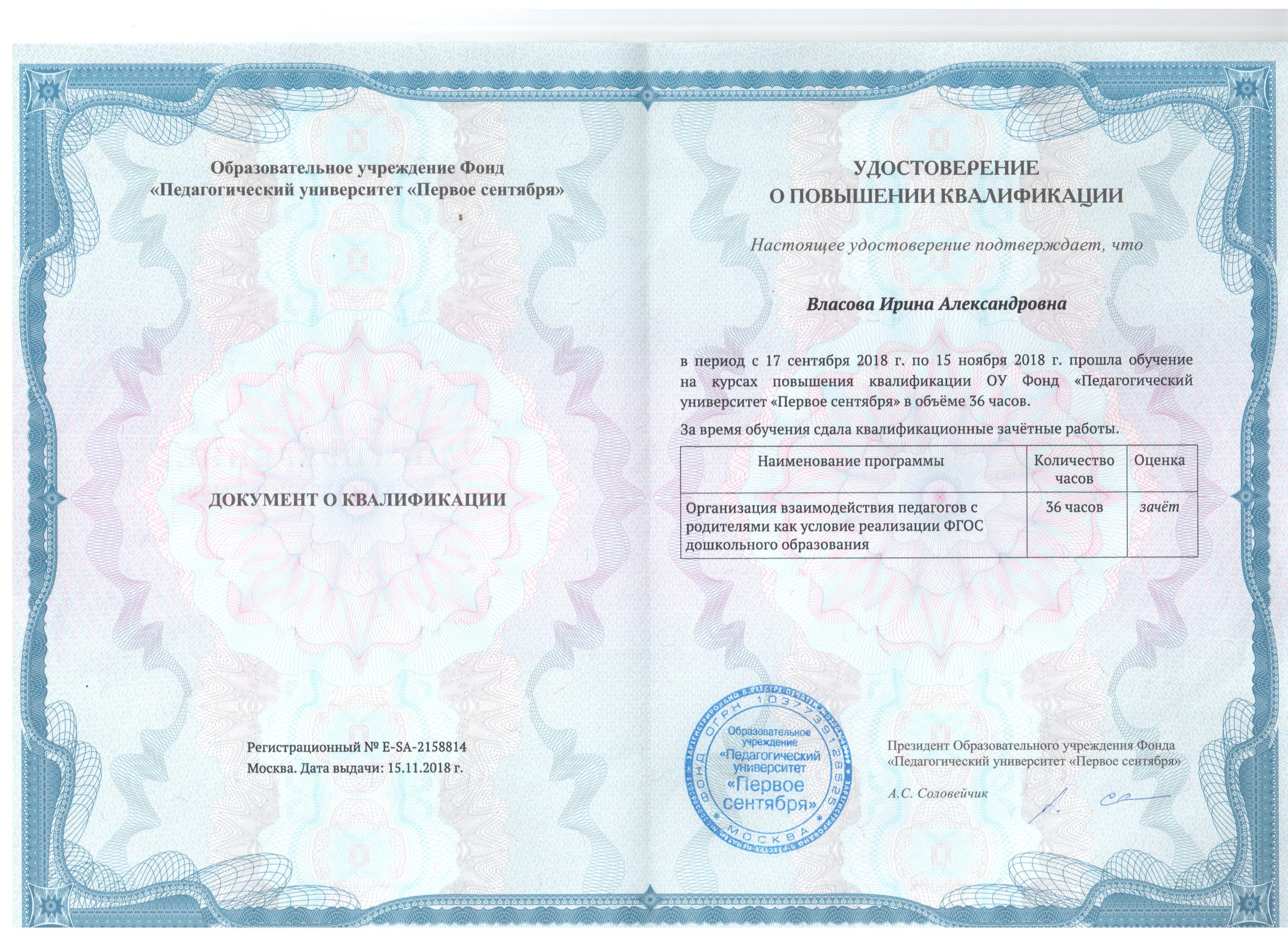 - С 17 сентября 2018г. по 15 ноября 2018г. «Организация взаимодействия педагогов с родителями как условие реализации ФГОС дошкольного образования», ОУ Фонд Педагогический университет «Первое сентябряч», г.Москва, в объеме 36 часов