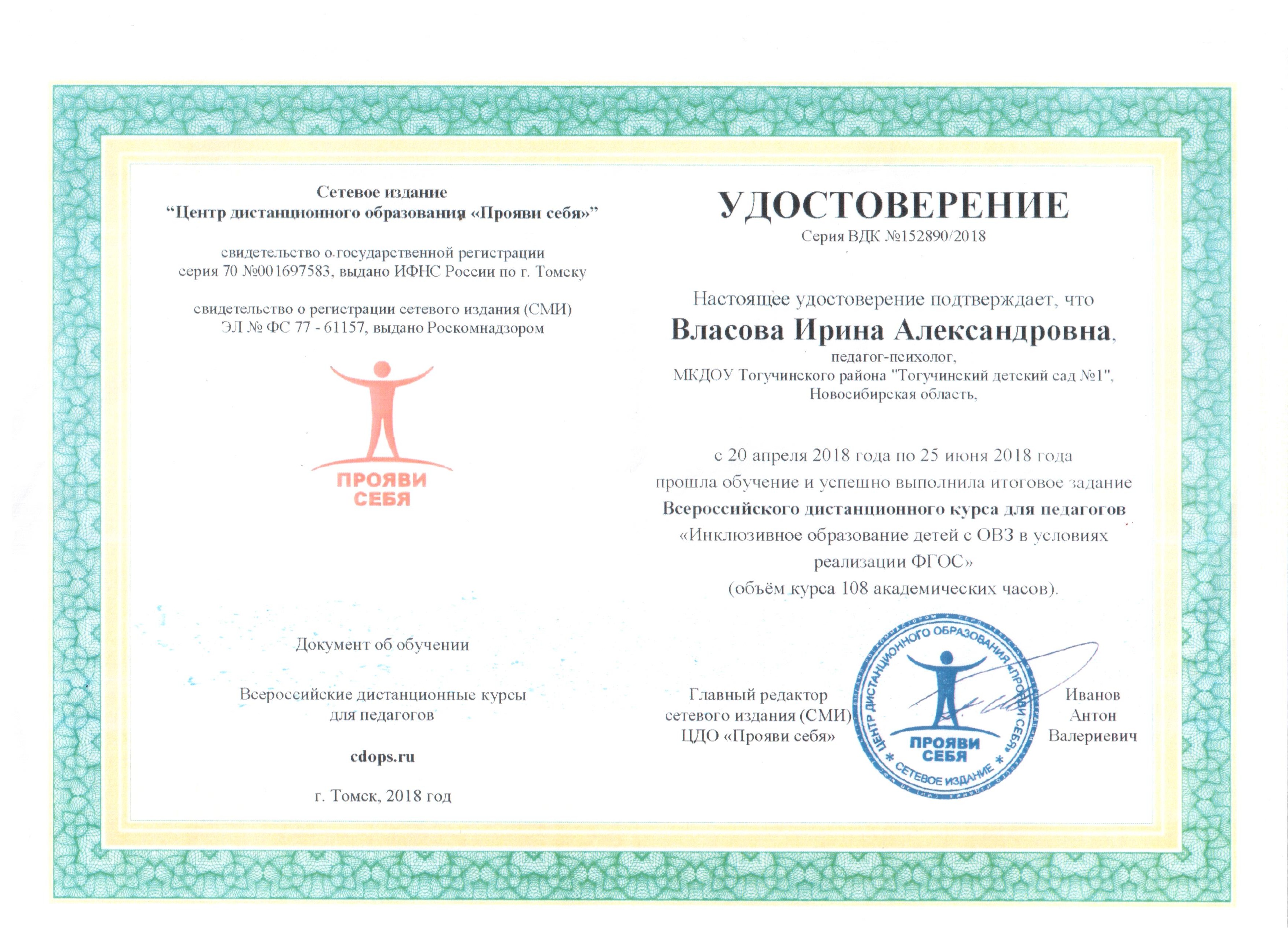 - С 20 апреля 2018г. по 25 июня 2018г. «Инклюзивное образование детей с ОВЗ в условиях реализации ФГОС» ,Центр дистанционного образования «Прояви себя», г.Томск, в объеме 108 часов