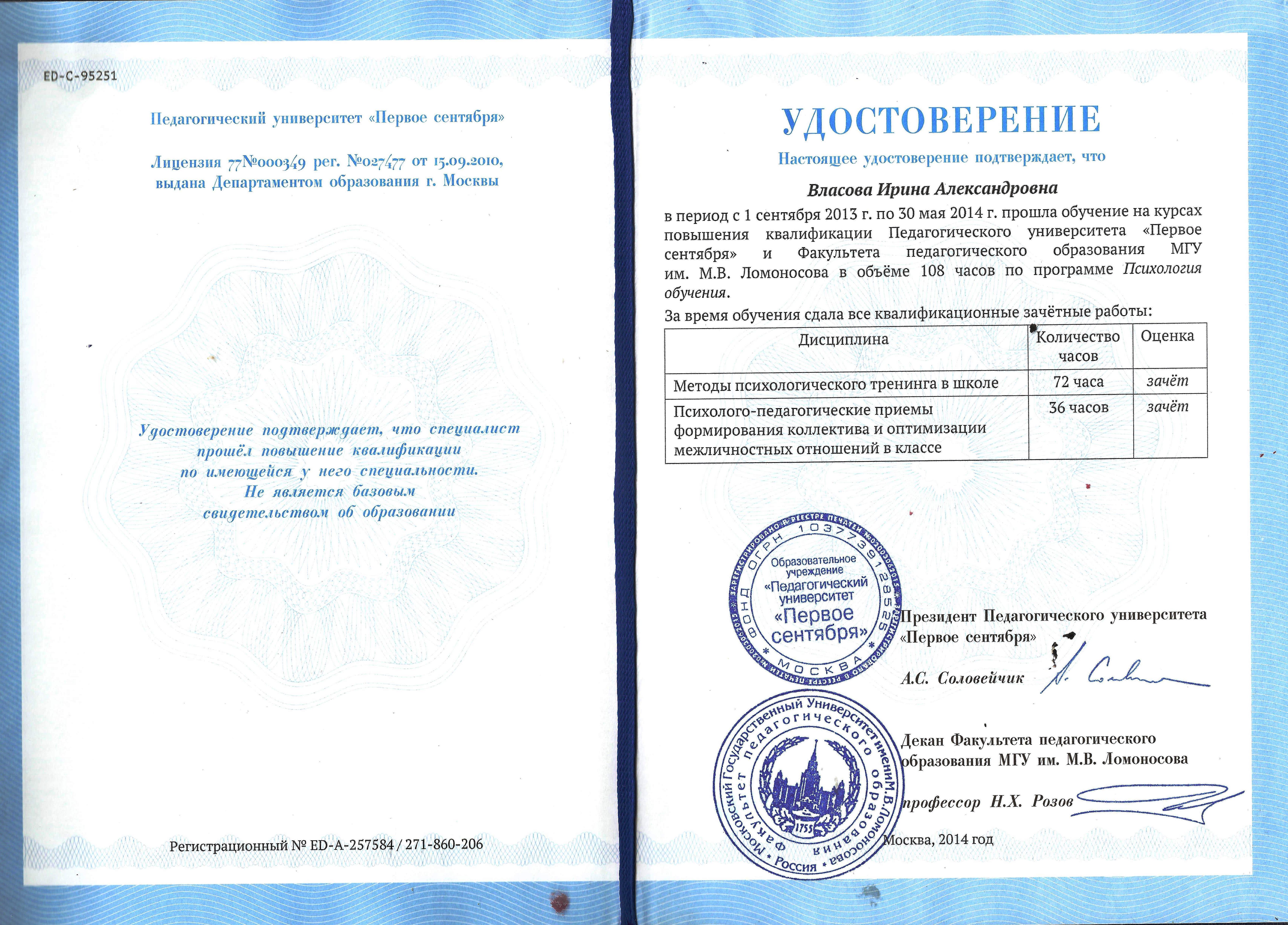 - ОУ Педагогический университет «Первое сентября», «Методы психологического тренинга в школе», с 01 сентября 2013 г. по 30 мая 2014 г. в объеме 72 ч.; «Психолого-педагогические приемы формирования коллектива и оптимизации межличностных отношений в классе»,с 01 сентября 2013 г. по 30 мая 2014 г. в объеме 36 ч.; /kursy_ud_001.jpg