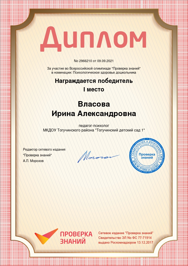 - Университет Первое сентября. Модульный курс «Поведенческие проблемы обучения дошкольников и младших школьников: рекомендации по профилактике и коррекции», в объеме 6 часов. От 20.03.2020г.